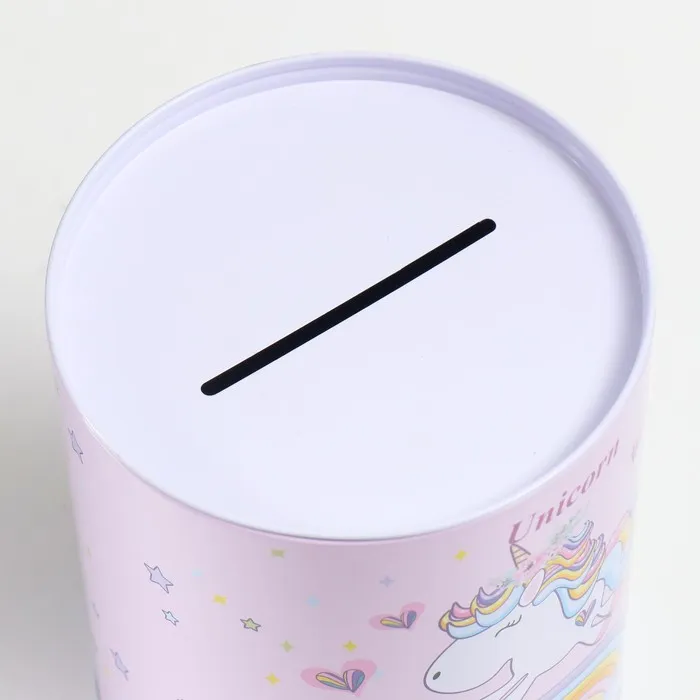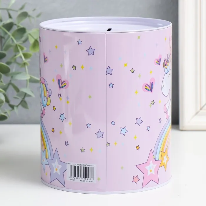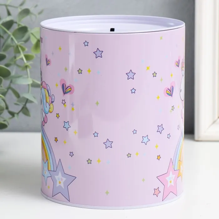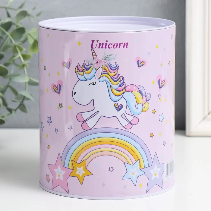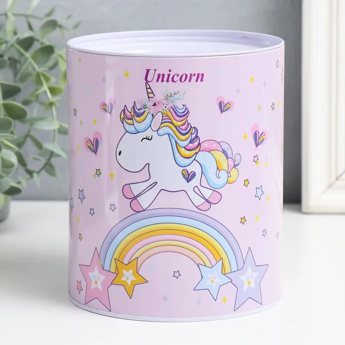 Пять металлических копилок в виде стилизованных консервных банок с очаровательным единорогом на радуге создают целую систему для сортировки сбережений. Разный размер (от 7.5×10.5 см до 13.5×16 см) позволяет удобно распределять средства по целям или просто собирать коллекцию.