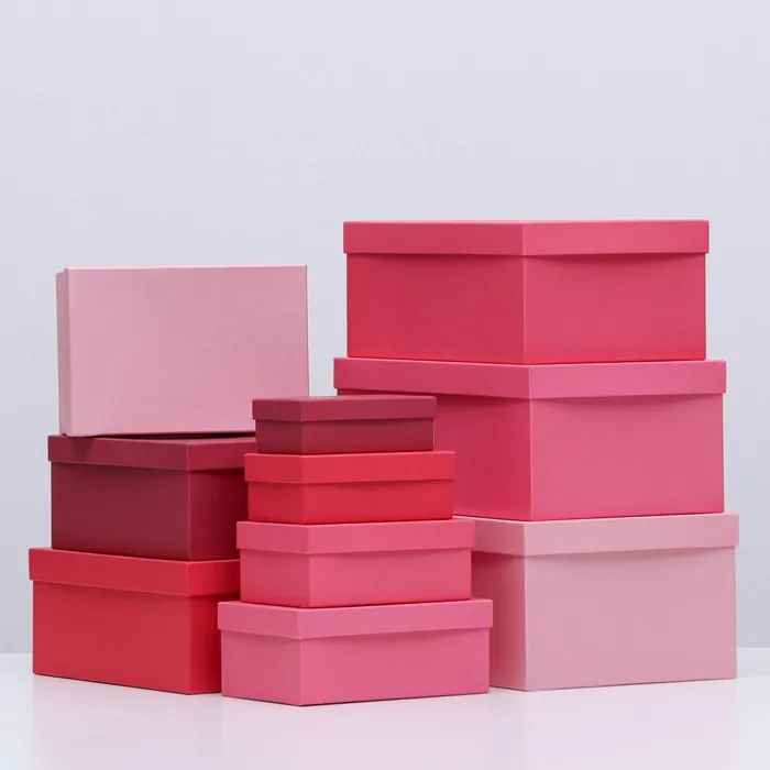 Набор из 10 прямоугольных коробок в оттенках красного, розового и бордового — это универсальное решение для упаковки подарков или хранения вещей. Однотонный дизайн делает коробки подходящими для любого праздника или повода, а плотный картон обеспечивает их надёжность и долговечность.