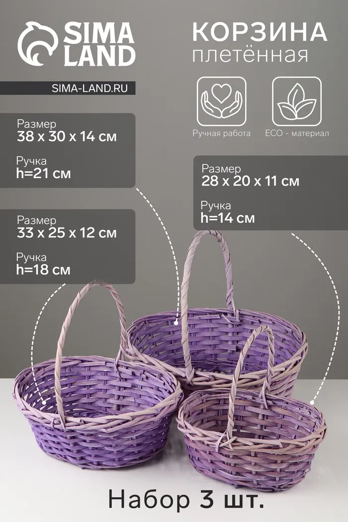 Набор корзин, 3шт., 44х33х14х40CM,38х28х12.5х35CM32х23х11х30CM,лоза — Характеристики