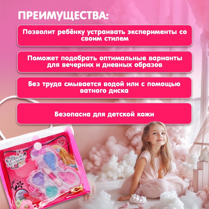 Детская косметика «Школа макияжа» позволит ребёнку устраивать эксперименты со своим стилем. Набор поможет девочке подобрать оптимальные варианты для вечерних и дневных образов. Хранить это можно в косметичке, которая также входит в комплект. Косметика без труда смывается водой или с помощью ватного диска и безопасна для детской кожи.