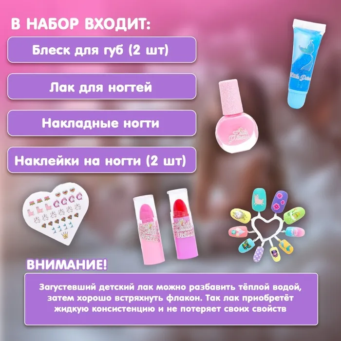 Набор косметики для девочки "Маленькая принцесса" с накладными ногтями - это увлекательный комплект, включающий в себя: