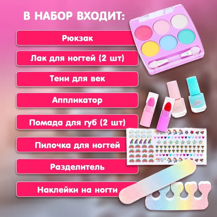 - Рюкзак: Стильный рюкзак с милым дизайном "Единорог", который можно использовать для удобного хранения всей косметики.