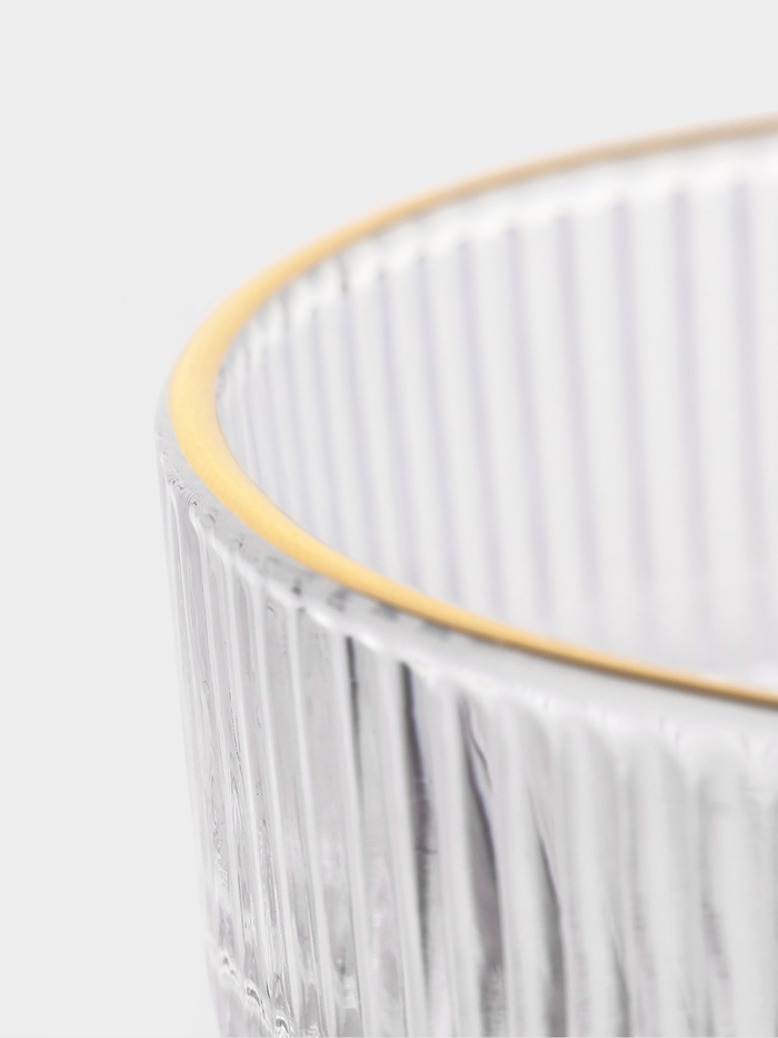 Шесть прозрачных чашек с тонкой золотой окантовкой и рельефной фактурой превращают сервировку в искусство, подчеркивая вкус и статус любого застолья.
