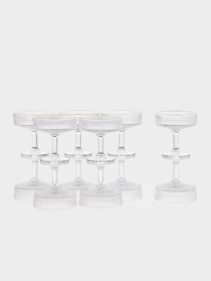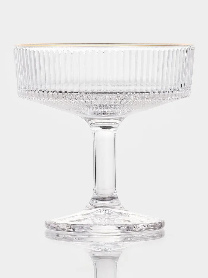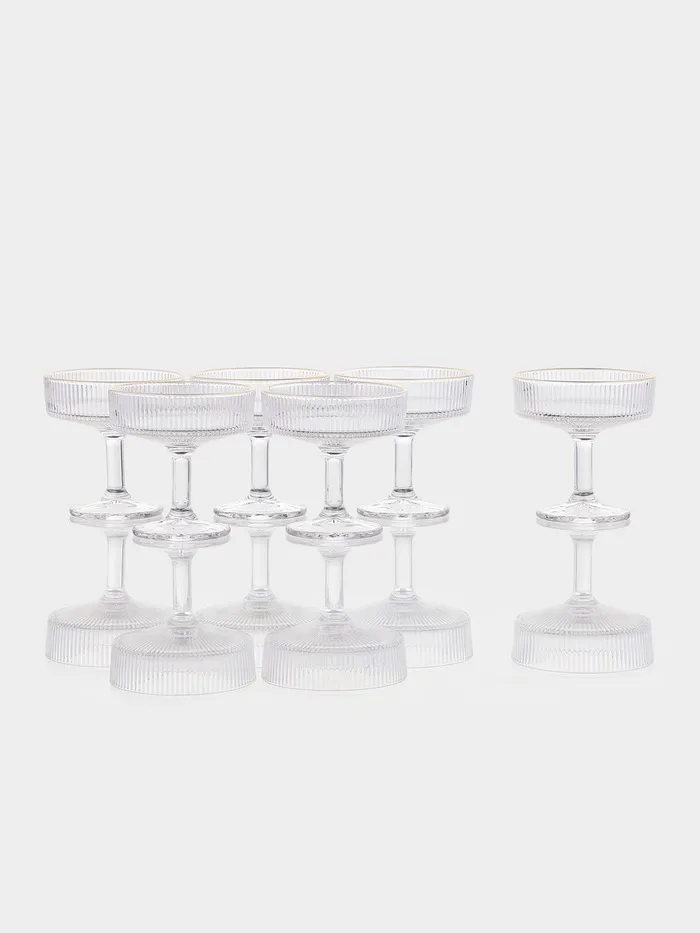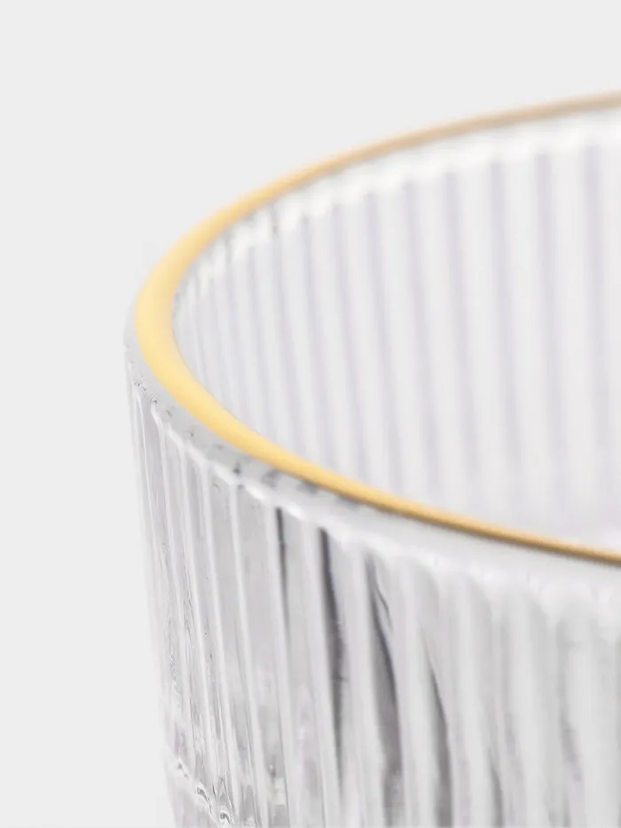 Шесть прозрачных чашек с тонкой золотой окантовкой и рельефной фактурой превращают сервировку в искусство, подчеркивая вкус и статус любого застолья.