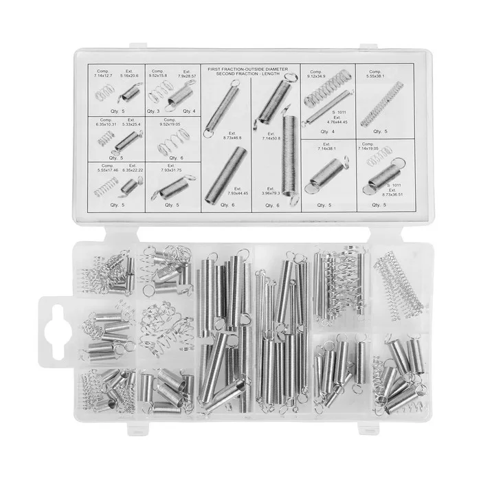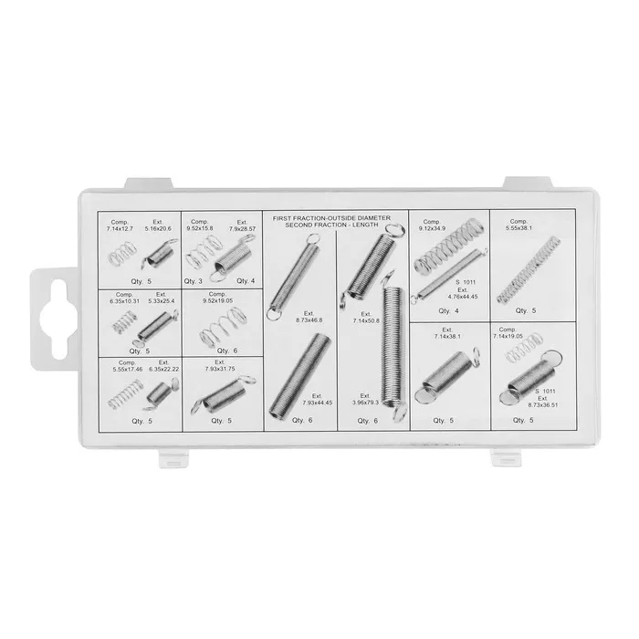 Набор представляет собой комплект из 100 сверхмощных стальных пружин разного размера. Включает в себя широкий спектр небольших компрессионных и удлинительных пружин для мастерских и ремонтных работ различных применений. Подходит, например, для замены старых, ржавых, повреждённых пружин. Также набор может пригодится и дома, для ремонта дверных задвижек, пружинных замков и пр. Поставляется в пластиковом кейсе для удобной транспортировки, безопасного хранения и быстрой организации.