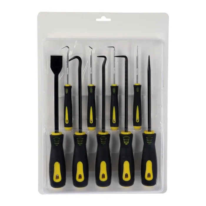 Полный комплект для сложного демонтажа уплотнений! Профессиональный набор крючков для колец ТУНДРА — это девять усиленных инструментов с двухкомпонентными рукоятками. Набор покрывает все задачи по извлечению уплотнительных колец в промышленном оборудовании и автомобильных узлах.