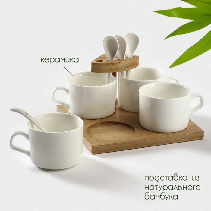 Набор кружек керамический на подставке из бамбука BellaTenero, 9 предметов: 4 кружки 150 мл, 4 ложки, подставка, белый — Характеристики