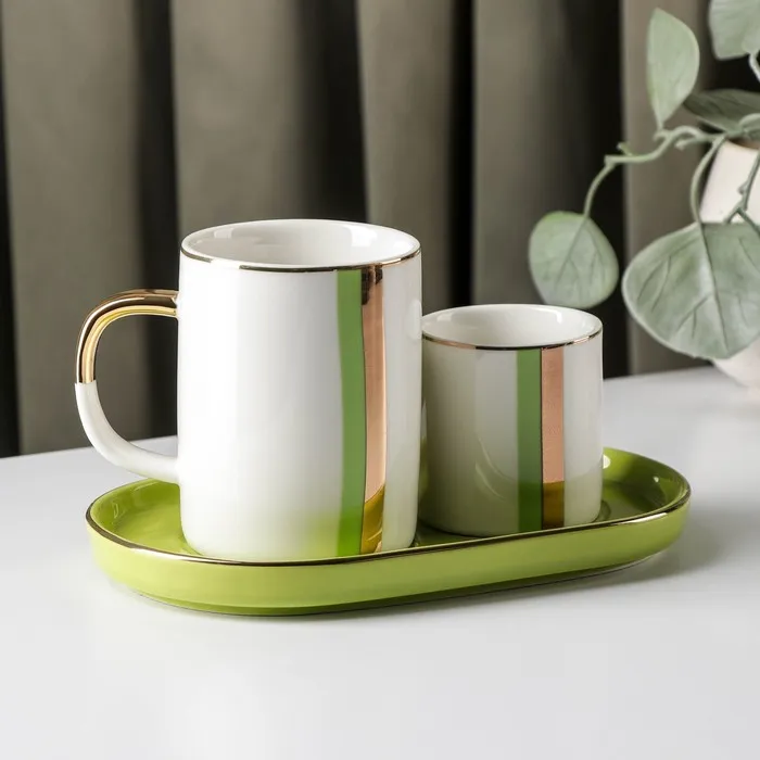 Набор керамических кружек с геометрическим рисунком и подставкой — это практичный и стильный комплект для ежедневного использования. В набор входят две кружки объемом 80 мл и 200 мл, выполненные из качественной керамики с гладкой поверхностью. Зеленый цвет и современный дизайн делают их подходящими для уютных домашних чаепитий или приятных подарков.