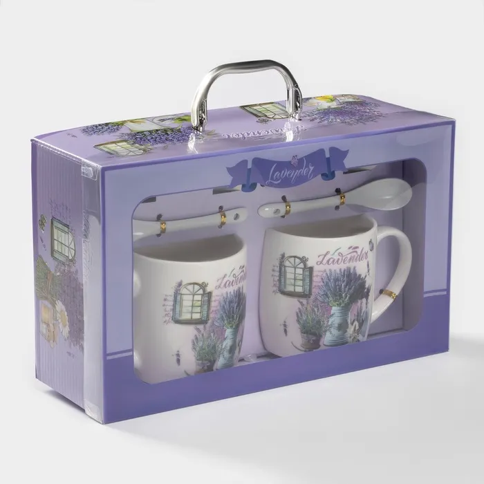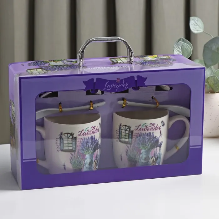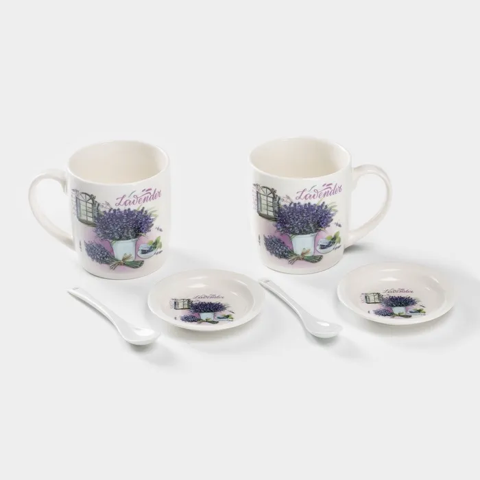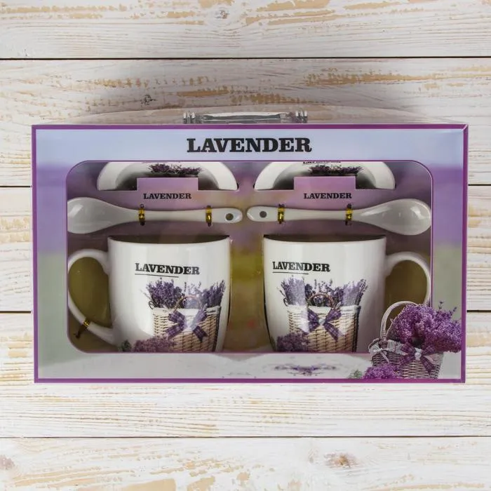 Набор кружек «Букет лаванды» состоит из двух керамических кружек объёмом 330 мл, ложек и подставок. Кружки изготовлены из высококачественной керамики, прочной и долговечной, их можно использовать в микроволновой печи и мыть в посудомоечной машине.