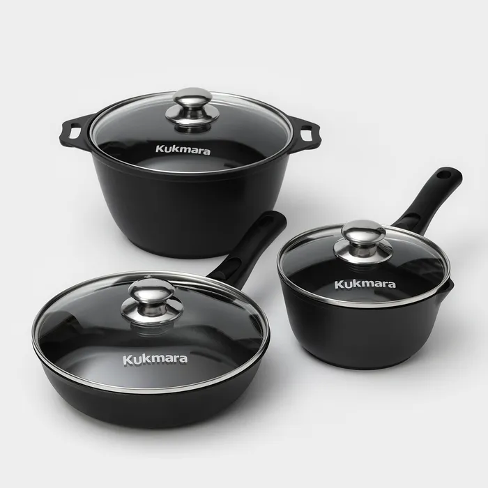 Посуда Kukmara сделана из литого алюминия. Имеет инновационное антипригарное мраморное покрытие нового поколения, которое изготовлено на водной основе по немецкой технологии (Weilburger Coatings GmbH) и усилено сверхтвёрдыми частицами минералов.