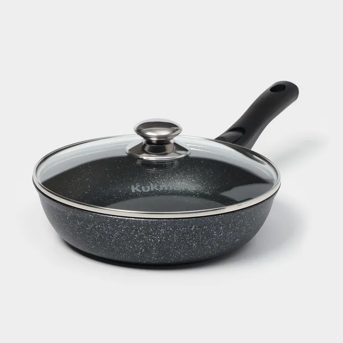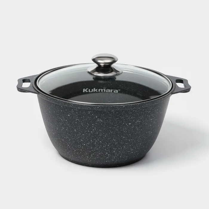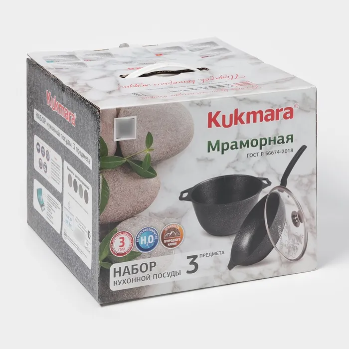 Посуда Kukmara сделана из литого алюминия. Имеет инновационное антипригарное мраморное покрытие нового поколения, которое изготовлено на водной основе по немецкой технологии (Weilburger Coatings GmbH) и усилено сверхтвёрдыми частицами минералов.