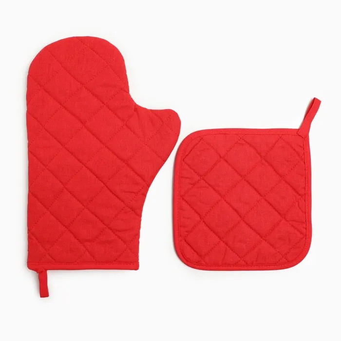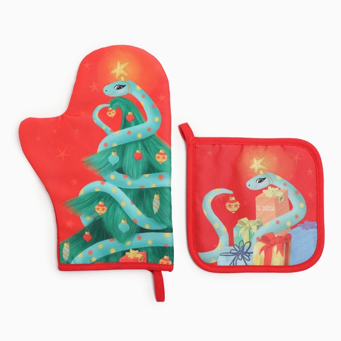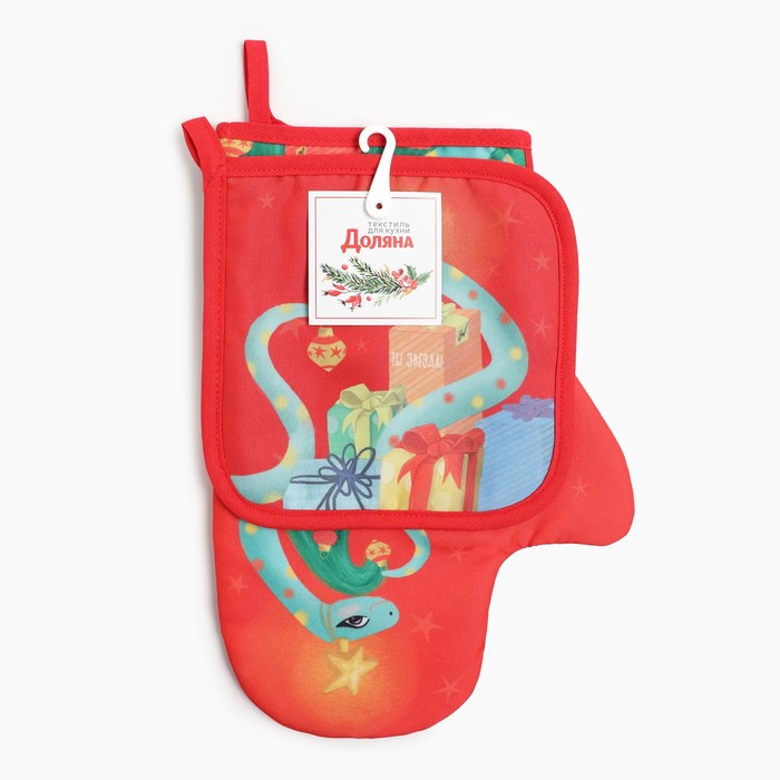 Набор кухонный Доляна "Новогодний подарок": прихватка 17х17 см, варежка-прихватка 20х28 см, 35% хлопок — Характеристики