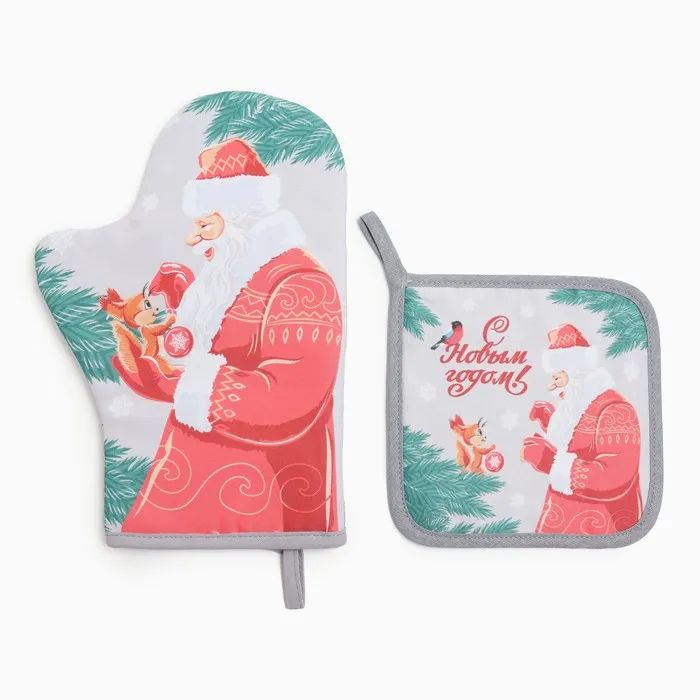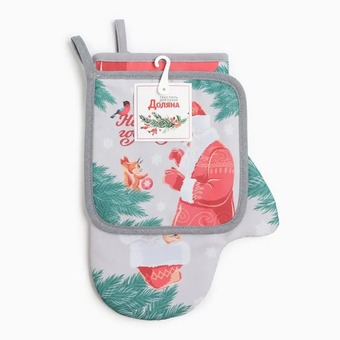 Набор кухонный Доляна "С новым годом": прихватка 17х17 см, Варежка-прихватка новогодняя 20х28 см, 35% хлопок