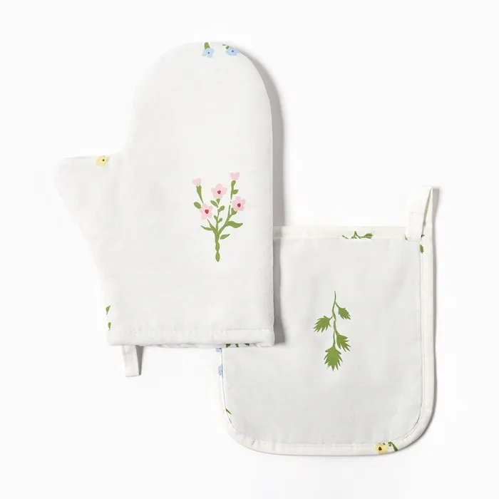 - В наборе две прихватки: варежка 20×28 см и квадратная 19×19 см.
