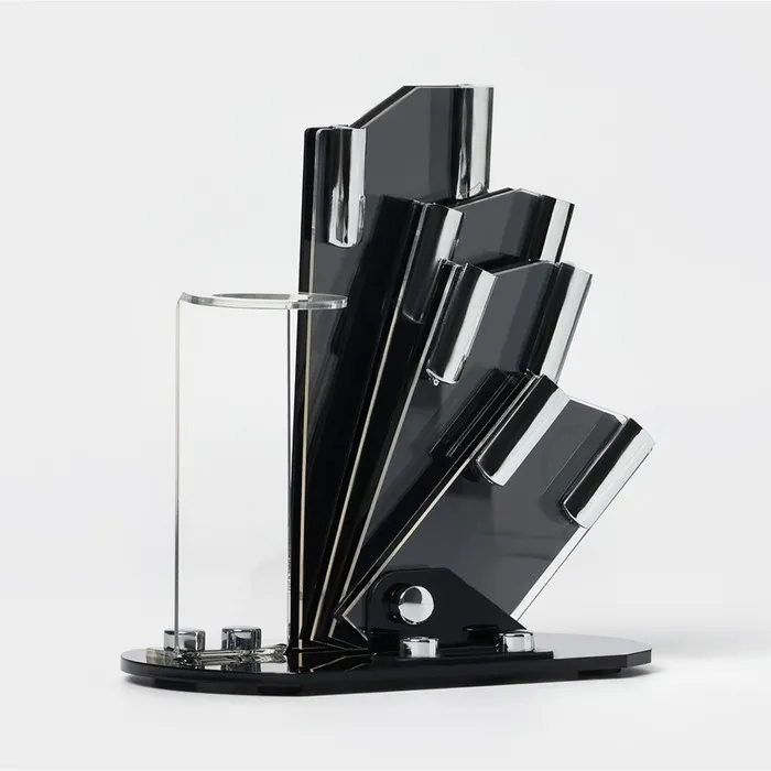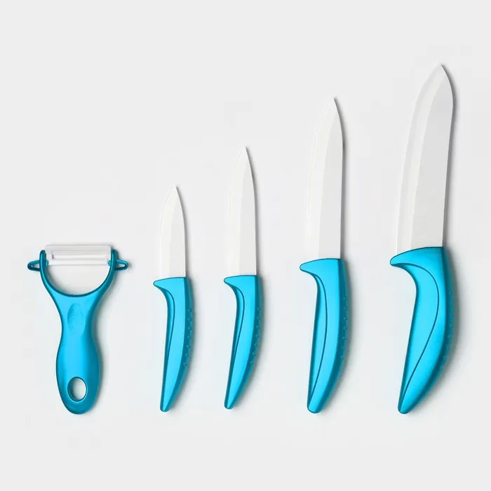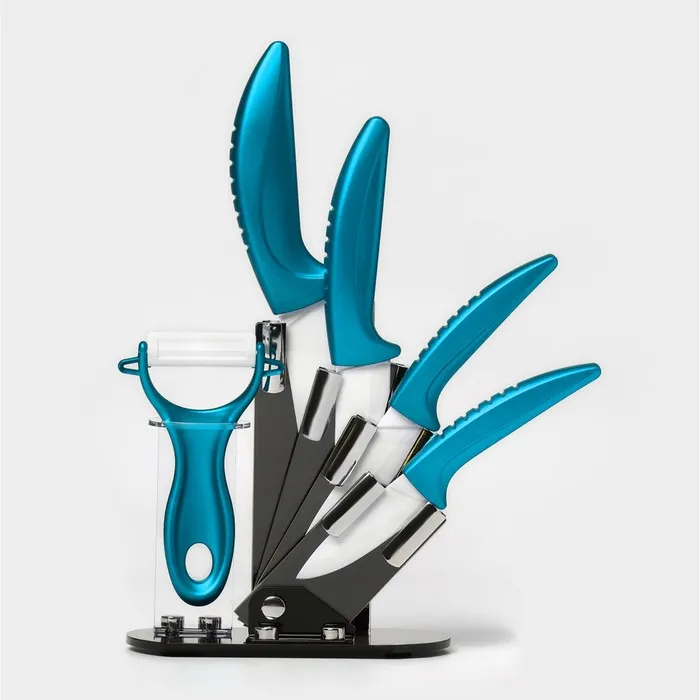 Такой полезный предмет, как Набор кухонный на подставке «Изгиб», 5 предметов: 4 ножа, 7.5 см, 10 см, 13 см, 15 см, овощечистка, синий, незаменим на Вашей кухне. Эргономичная пластиковая ручка позволяет держать нож свободно и максимально удобно. Нарезать продукты или чистить овощи — одно удовольствие! Благодаря сверхвысокой твёрдости керамического лезвия ножом можно резать без заточки долгие годы, на нём не появляются царапины, и при этом он ощутимо легче стального.