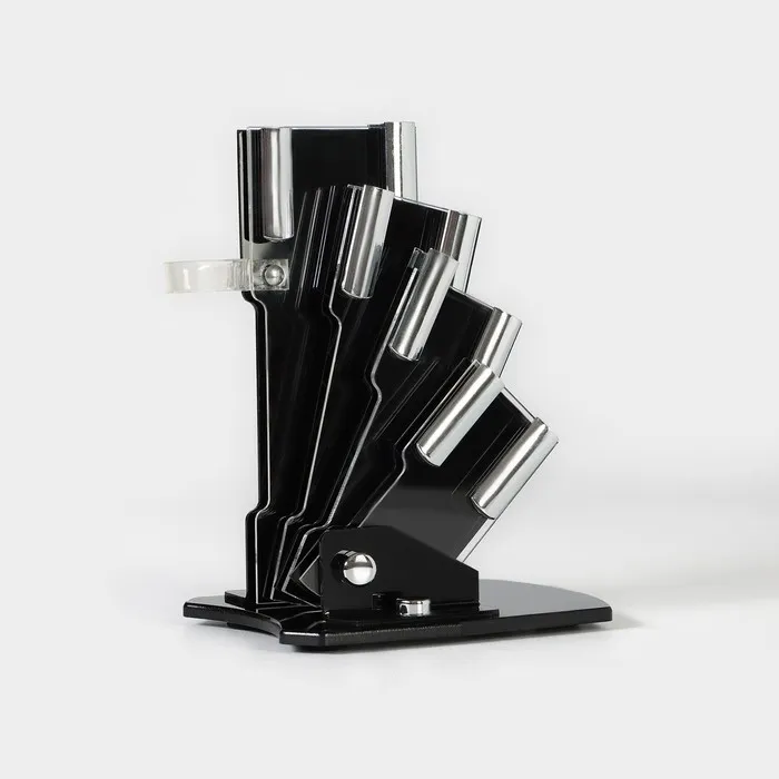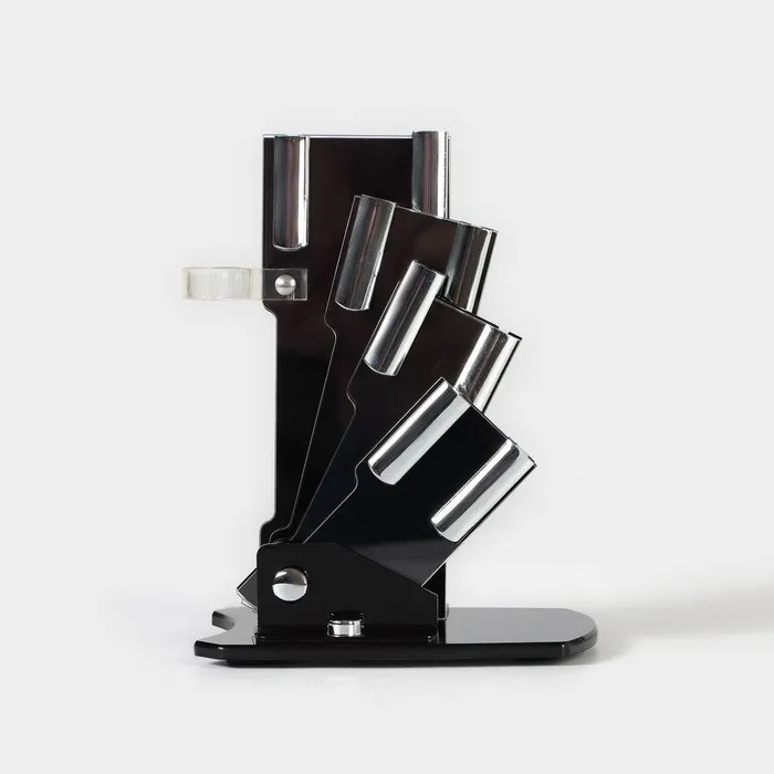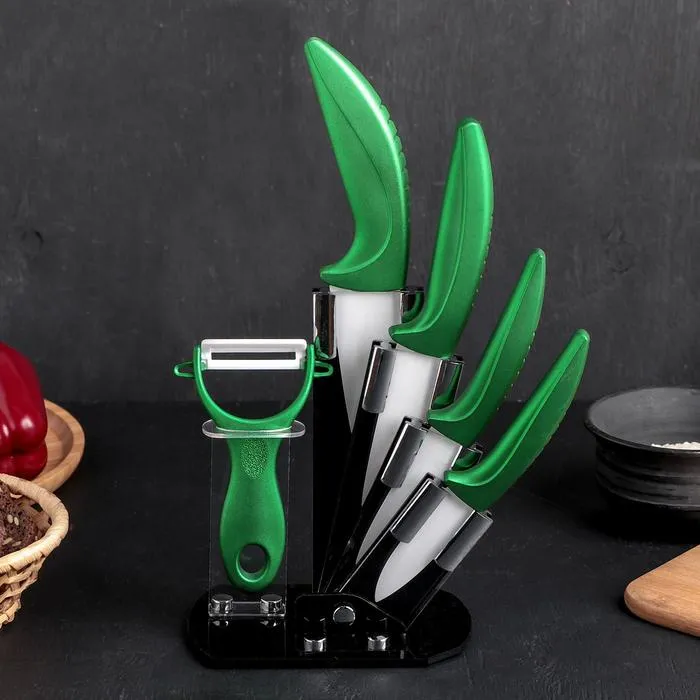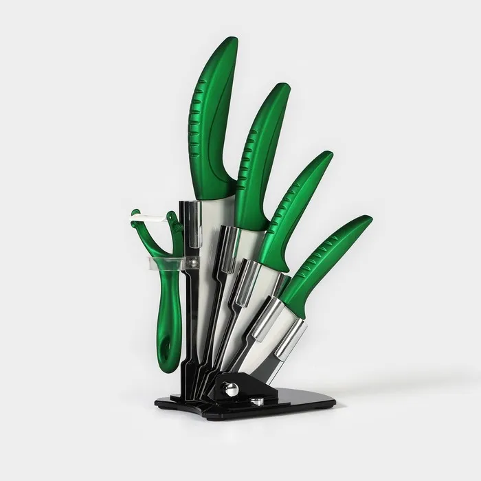 Набор кухонный на подставке «Изгиб», 5 предметов: 4 ножа, 7,5 см, 10 см, 13 см, 15 см, овощечистка, цвет зелёный
