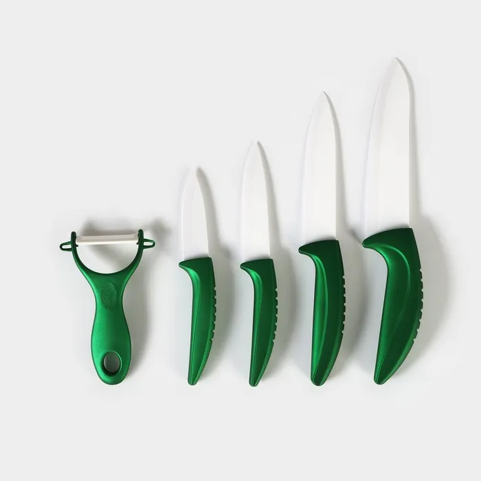 Набор кухонный на подставке «Изгиб», 5 предметов: 4 ножа, 7,5 см, 10 см, 13 см, 15 см, овощечистка, цвет зелёный — Характеристики