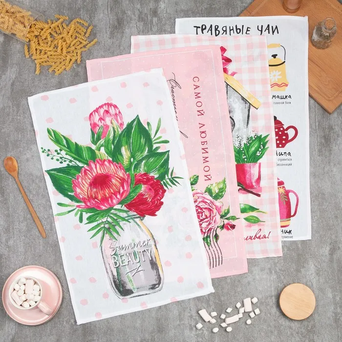 Набор кухонных полотенец Доляна «Самой любимой», 35×60 см-4 шт., 100% хлопок — Характеристики
