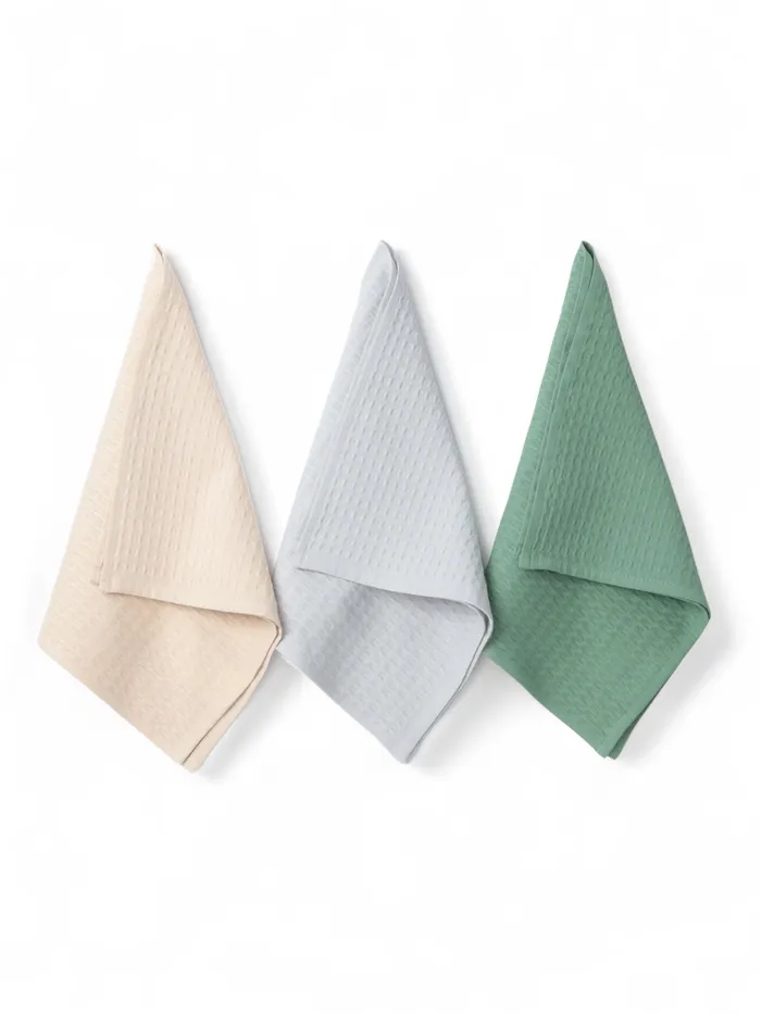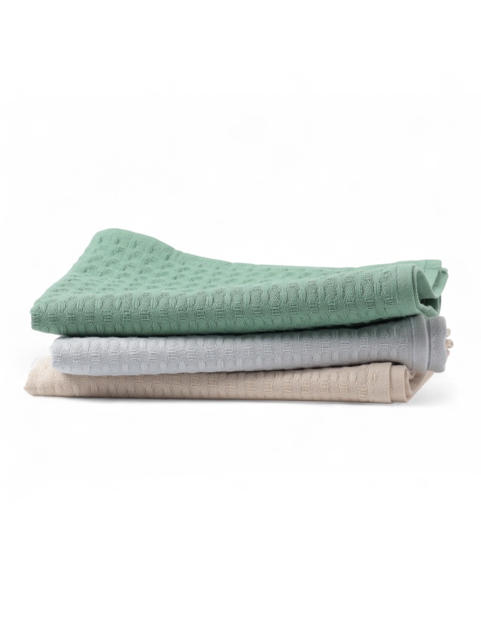 Освежите интерьер вашей кухни с помощью нашего набора кухонных вафельных полотенец в спокойных природных оттенках. Три полотенца в сером, бежевом и зеленом цветах станут незаменимыми помощниками в ежедневных заботах.