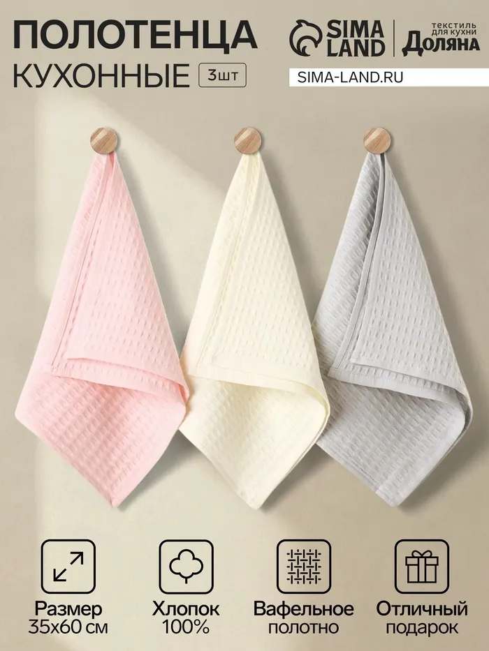 Набор кухонных полотенец «Доляна»: серое, розовое, белое, 35×60 см - 3 шт., хлопок 100% — Характеристики