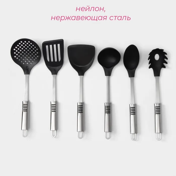 Набор кухонных принадлежностей Доляна «Фидель», 6 предметов, на подставке, чёрный — Характеристики
