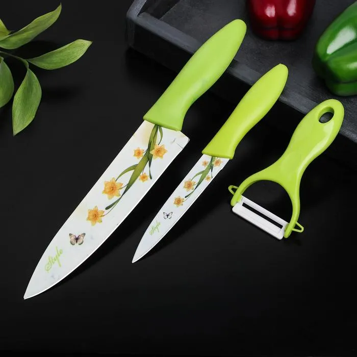 Кухонный набор с антипригарным покрытием — это практичные инструменты для ежедневной готовки, объединённые в едином стиле. В комплект входят два универсальных ножа и овощечистка. Лезвия из нержавеющей стали с антискользящим слоем обеспечивают чистый и лёгкий рез, а фиолетово-белые ручки с рисунком делают набор заметным элементом кухни. Простая форма и продуманная эргономика повышают удобство при нарезке и очистке.