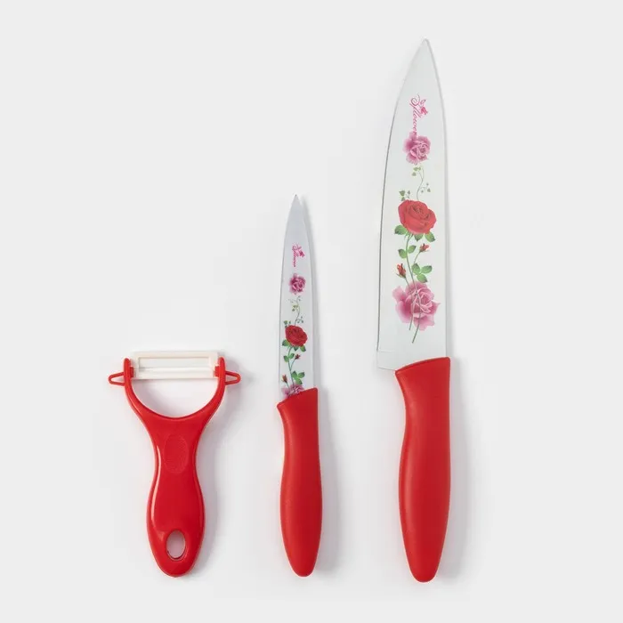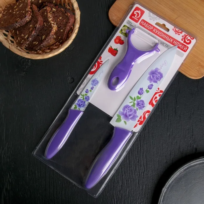 Набор кухонных принадлежностей Доляна «Нарцисс», 3 предмета: нож 2 шт., овощечистка, нержавеющая сталь, фиолетовый — Характеристики