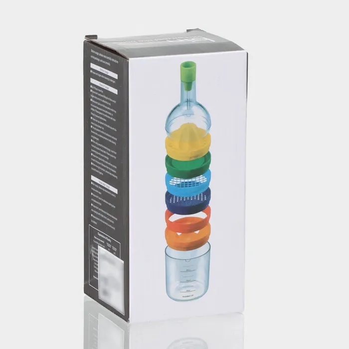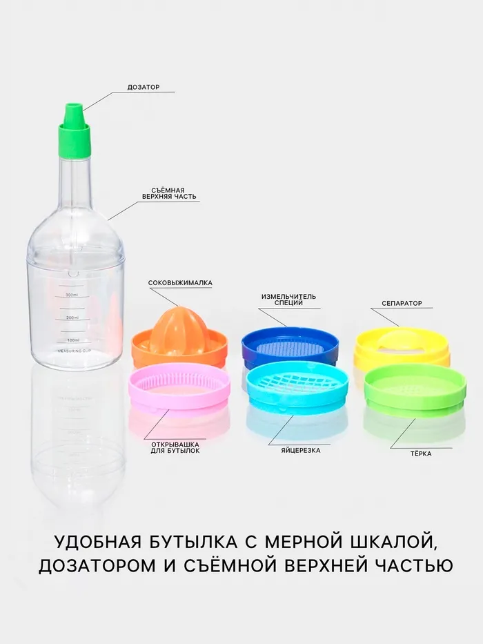 Набор кухонных принадлежностей Kitchen, бутылка-мерный стакан 380 мл, 7 насадок, 29×8.5 см, разноцветный — Характеристики