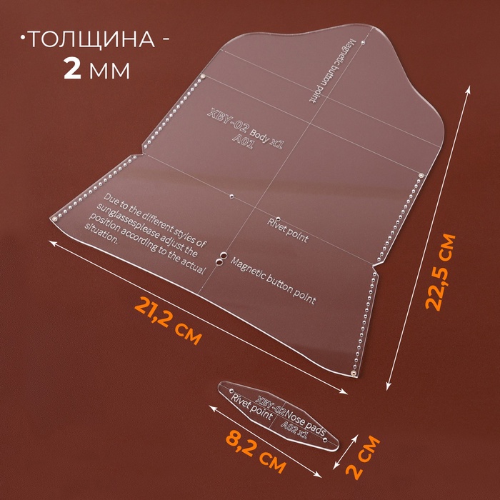Набор включает два лекала размером 17 × 8 × 0,5 см, выполненных из прочного акрила толщиной 2 мм. Их прозрачная структура обеспечивает удобство работы, позволяя чётко видеть разметку и контролировать процесс. Компактные размеры и лёгкость делают их удобными для использования с различными материалами, такими как кожа, картон или плотная ткань.