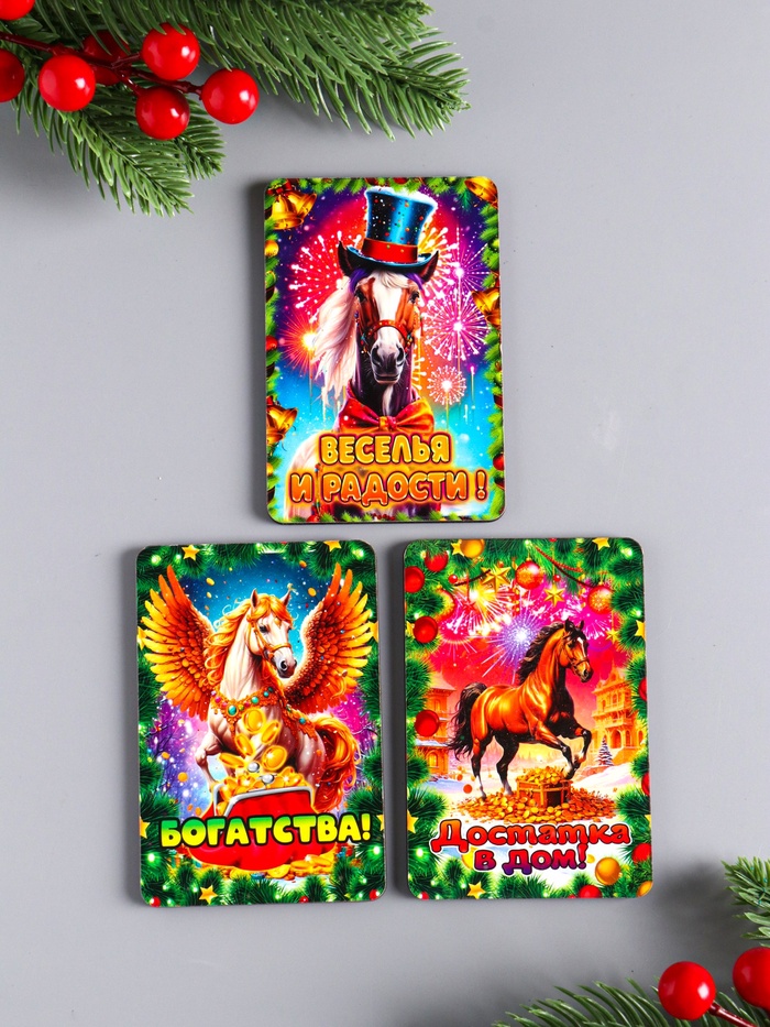 Набор магнитов на холодильник 3 шт. «Конь новогодний: Достатка в дом, богатства, веселья и радости»