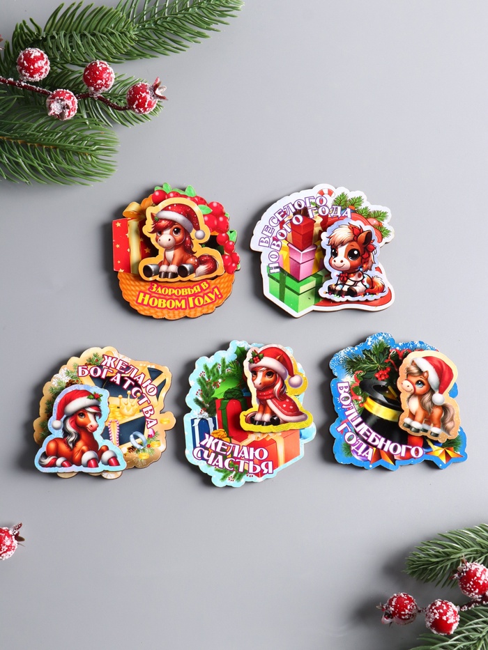 Порадуйте своих близких или друзей уникальным элементом новогоднего декора — набором магнитов с лошадками. Этот весёлый комплект из пяти изделий создан из дерева и украшен изображением символа года 2026 — Лошади. Идеальный способ добавить каплю волшебства в праздничный интерьер и привнести атмосферу уюта и тепла в ваш дом.