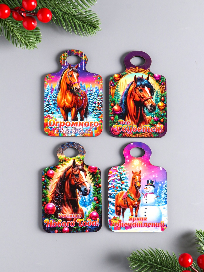 Набор магнитов на холодильник 4 шт. «Доска разделочная с конём: Огромного счастья, всё сбудется, ярких впечатлений»