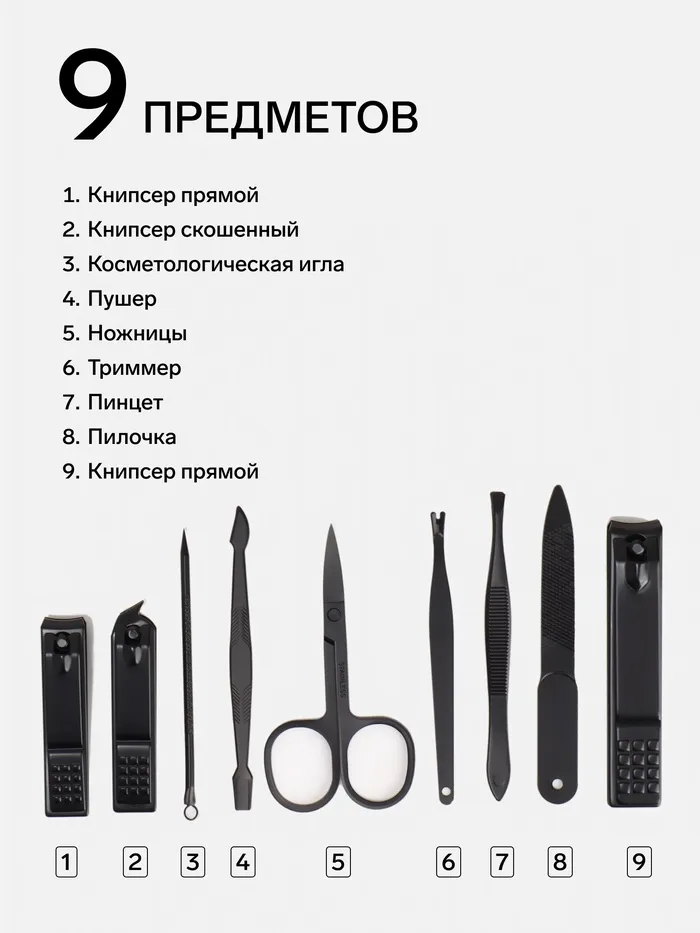 Набор маникюрный BLACK, 9 предметов, в футляре, чёрный — Характеристики