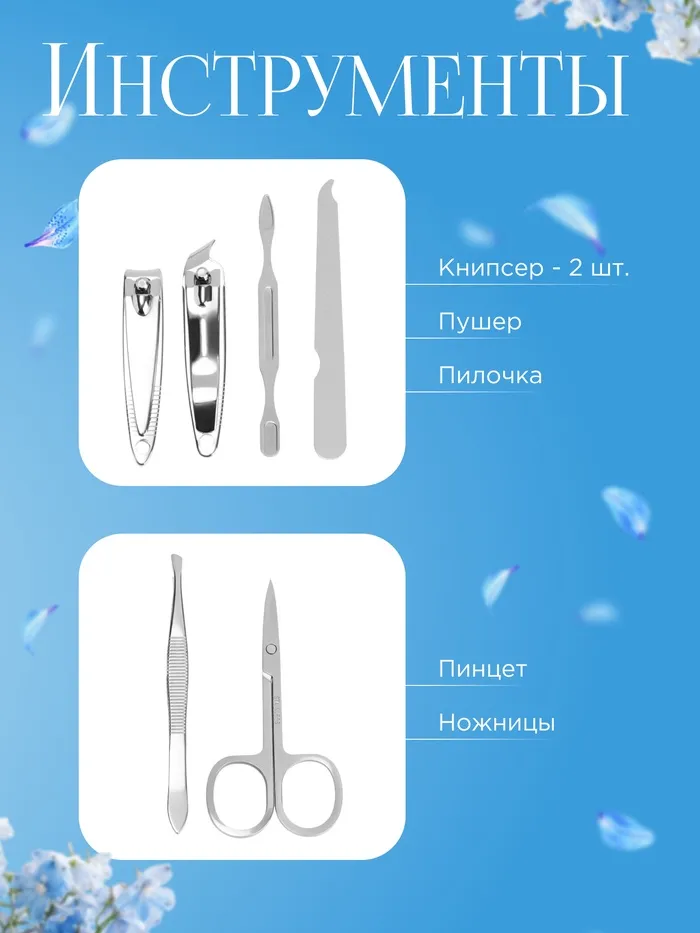 Набор включает в себя все необходимые инструменты для ухода за ногтями и кутикулой, обеспечивая профессиональный результат в домашних условиях. В наборе вы найдёте качественные и надёжные инструменты, которые изготовлены из прочных материалов и прослужат долгое время. Они легко помещаются в специальный чехол, что делает набор удобным для хранения и транспортировки.