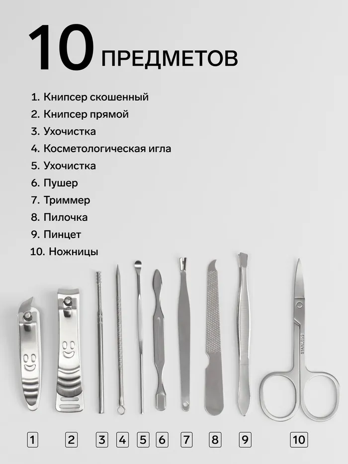Комплект из 10 удобных и незаменимых принадлежностей пригодится не только дома, но и в поездке или путешествии. Они в любой ситуации помогут сохранять привлекательный внешний вид. А удобный футляр, выполненный в лаконичном однотонном дизайне, обеспечит сохранность инструментов.