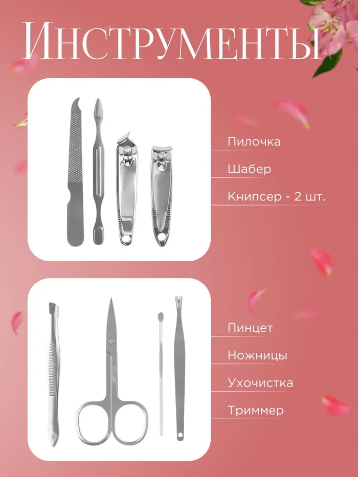 Комплект принадлежностей для маникюра пригодится дома, на работе и во время путешествий. В любых обстоятельствах эти инструменты помогут сохранить привлекательный внешний вид ваших рук.