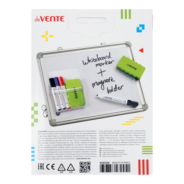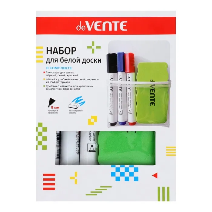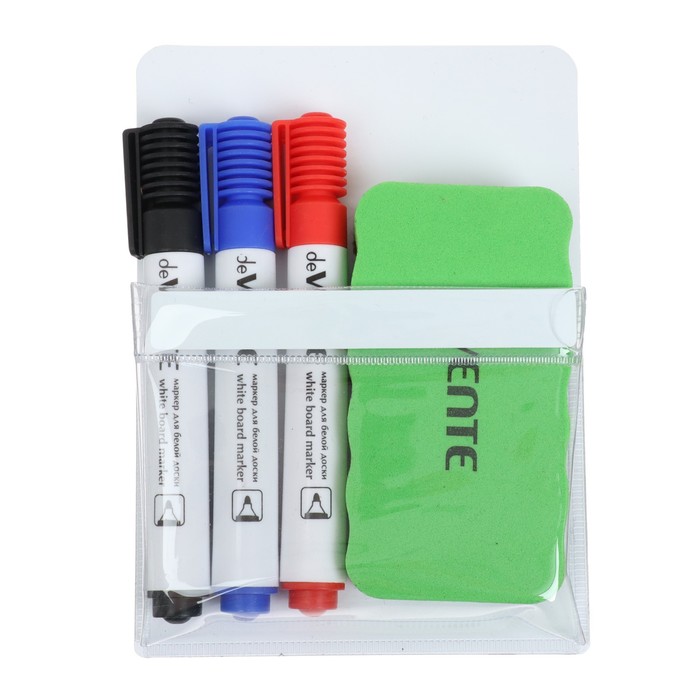 Набор маркеров для белой доски "deVENTE" + магнитная стирательная губка (03 цв - черн, син, кр.) круглый корпус с клипом, пулевидный наконечник, ширина линии 5 мм, в пластиковом кармане с магнитной основной для крепления к магнитной поверхности.