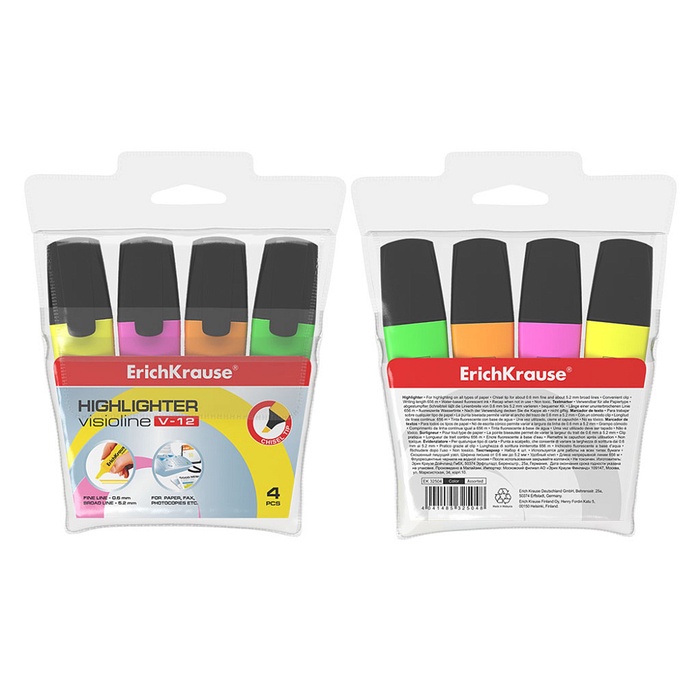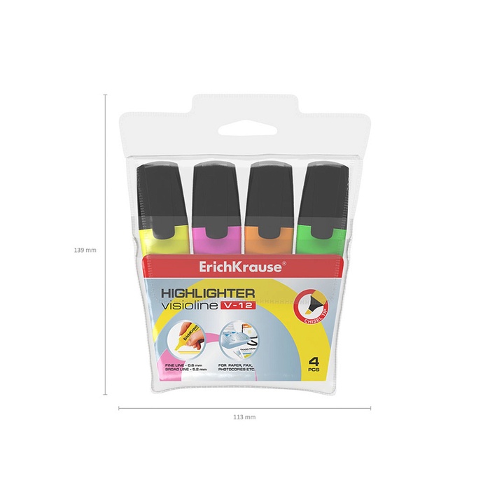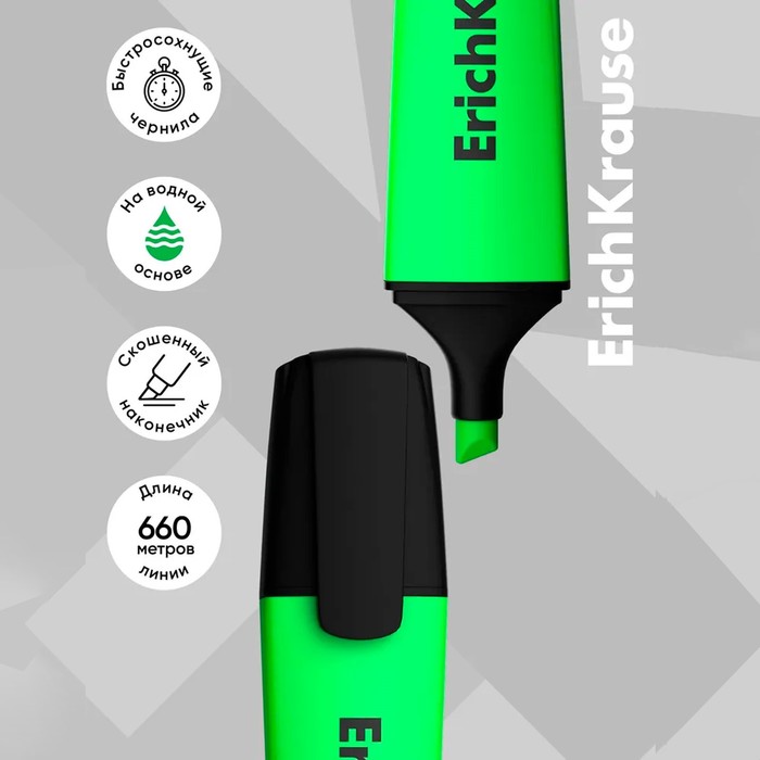 Текстмаркер предназначен для работы на всех типах бумаги, в том числе на бумаге для факсов и копировальных машин. Цвет корпуса соответствует цвету чернил. Пишущий узел скошенной формы позволяет варьировать ширину письма. Широкая часть наконечника 5.2 мм удобна для выделения текста, а тонкая 0.6 мм –для подчеркивания. Флуоресцентные чернила на водной основе быстро высыхают после нанесения и не оставляеют следов на обратной стороне бумаги за счет тонкого и равномерного нанесения. Имеет узнаваемую запатентованную форму и стал абсолютным бестселлером в ассортименте текстмаркеров ErichKrause® более чем в пятидесяти странах мира. Срок годности 5 лет.