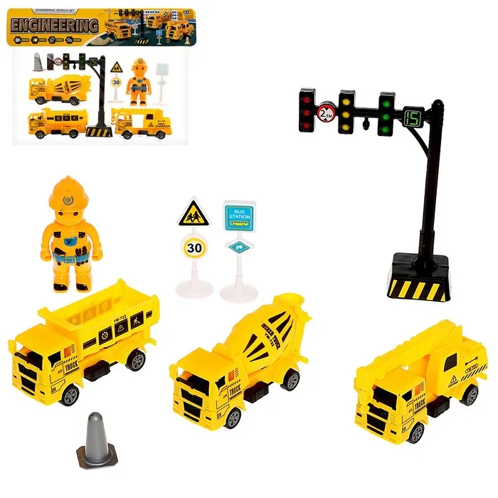 Строительная площадка в миниатюре для юных инженеров! Набор спецтехники с дорожными знаками — это комплект из 3 машинок и аксессуаров для сюжетных игр. Яркие жёлтые модели с подвижными элементами и светофором помогут мальчику от 3 лет создать свою стройплощадку.
