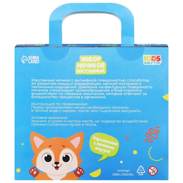 Набор массажных мячей подходит для детей и взрослых. Предназначен для физического воздействия на биологически-активные точки на теле человека для профилактики и лечения ряда заболеваний. С целью общего оздоровления организма, укрепления иммунитета, расслабления, снятия физического и психоэмоционального перенапряжения. Массажёр развивает моторику рук ребёнка, способствует улучшению памяти, внимания и развитию речи.