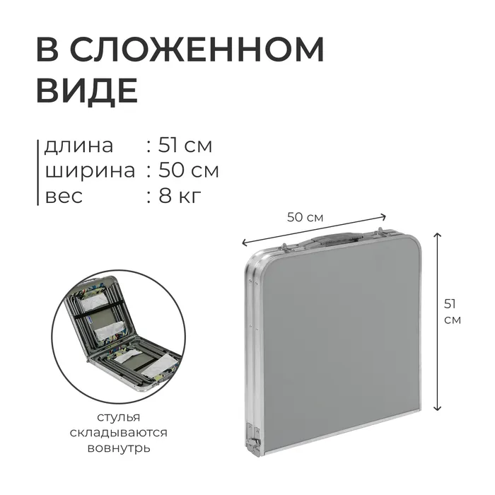 Туристический набор мебели — это идеальное решение для тех, кто ценит комфорт и функциональность в путешествиях. Комплект включает в себя компактный складной стол и стулья, которые вмещаются в удобный кейс с ручкой для транспортировки и хранения.