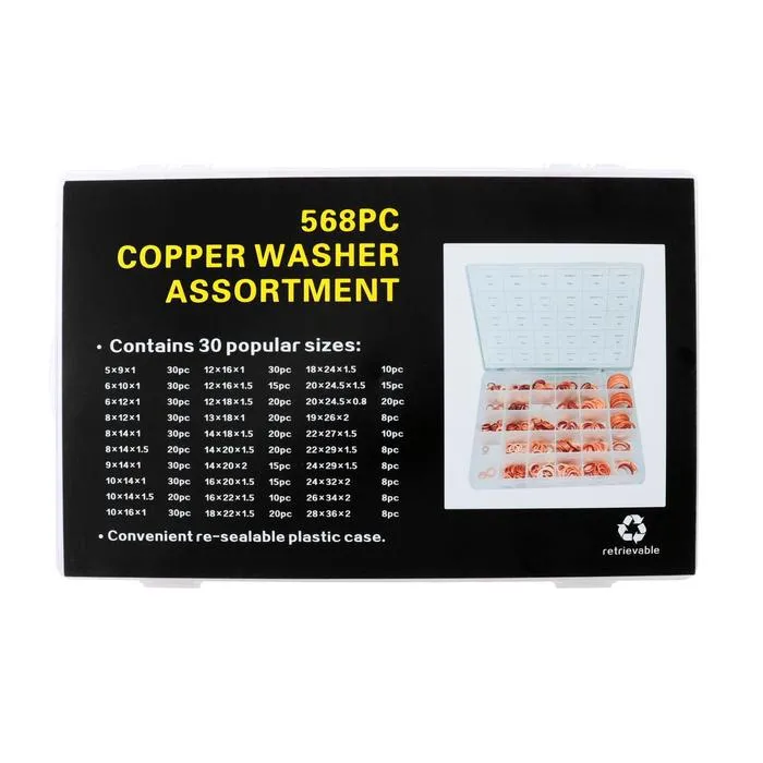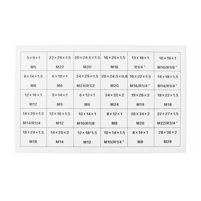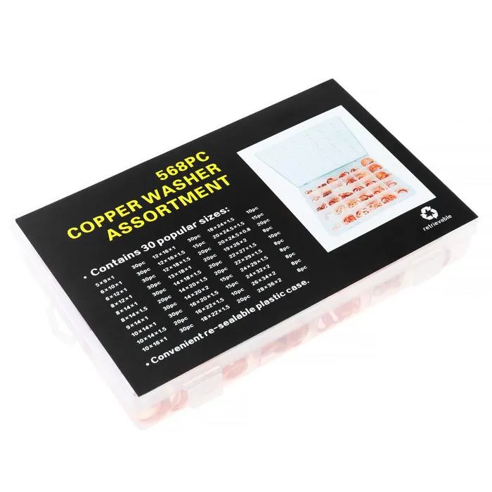 Набор предназначен для уплотнения резьбовых соединений различных элементов. Прокладка делает соединение адаптера с насадками и соединителя со шлангом более надёжным и герметичным. Набор медных прокладок предоставляется в компактном кейсе из пластика, который обладает отсеками под каждый размер и нумерацией размеров на крышке. Достаточно купить такой набор, чтобы надолго обеспечить дом нужными расходниками. Набор можно использовать в автосервисе и на станции технического обслуживания при ремонте системы кондиционирования автомобиля, а также во время других ремонтно-монтажных работ, например, сантехнических (для смесителей, фитингов и пр.). В комплекте представлены уплотнительные прокладки самых распространенных размеров.