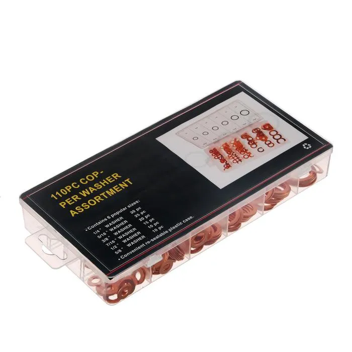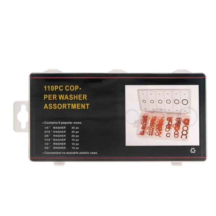 Набор предназначен для уплотнения резьбовых соединений различных элементов. Прокладка делает соединение адаптера с насадками и соединителя со шлангом более надёжным и герметичным. Набор медных прокладок предоставляется в компактном кейсе из пластика, который обладает отсеками под каждый размер и нумерацией размеров на крышке. Достаточно купить такой набор, чтобы надолго обеспечить дом нужными расходниками. Набор можно использовать в автосервисе и на станции технического обслуживания при ремонте системы кондиционирования автомобиля, а также во время других ремонтно-монтажных работ, например, сантехнических (для смесителей, фитингов и пр.). В комплекте представлены уплотнительные прокладки самых распространенных размеров.