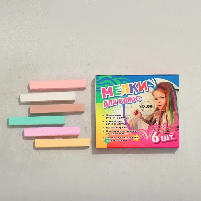 Мелки для волос — то, что нужно юной девчонке или подростку, чтобы подчеркнуть свою индивидуальность. Разноцветные прядки ярких или пастельных оттенков помогут не только ненадолго сменить имидж, но и поднять настроение. С помощью этого средства, юная принцесса, будет блистать своей красотой, радоваться и любоваться собой перед зеркалом. А самое главное, продукт не раздражает детскую кожу.