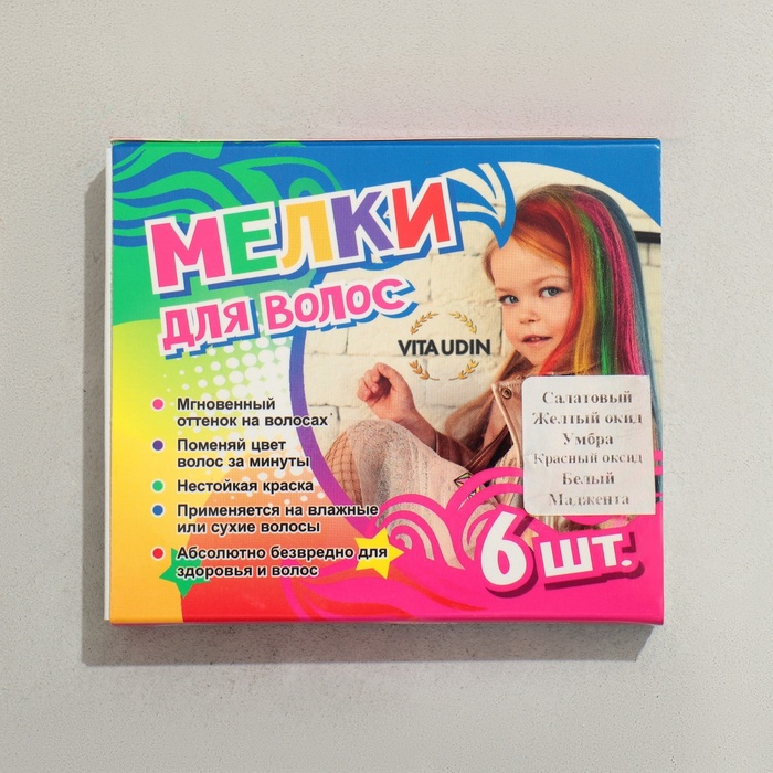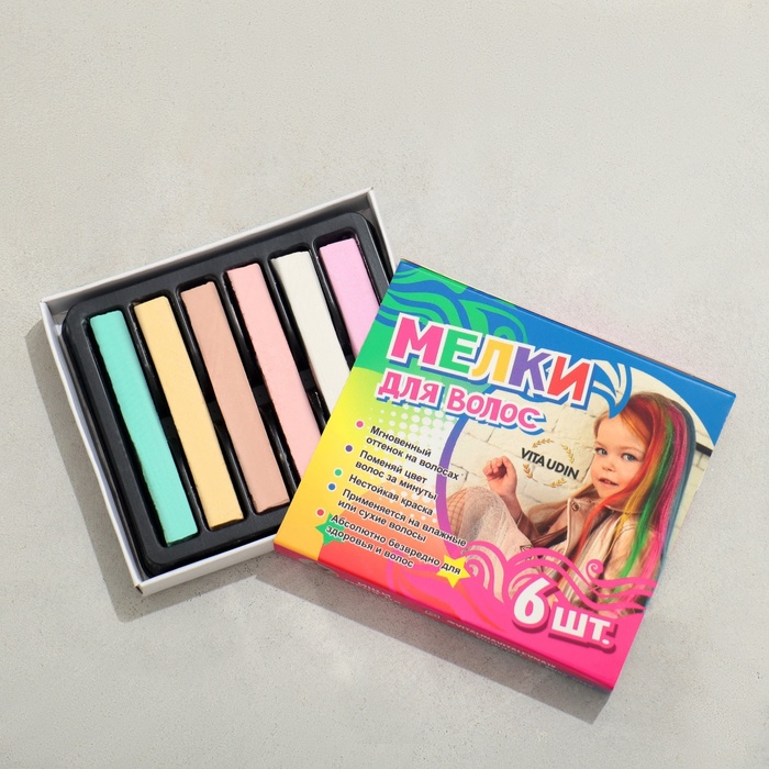 Набор мелков для волос, 6 шт. Цвета: салатовый, желтый, умбра, красный, белый, маджента — Характеристики
