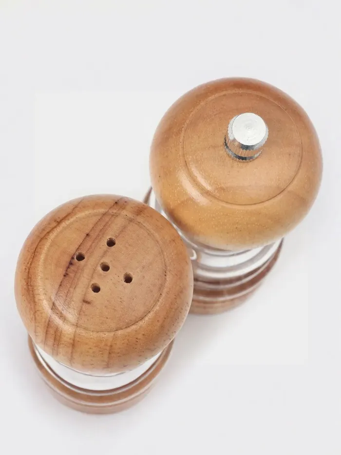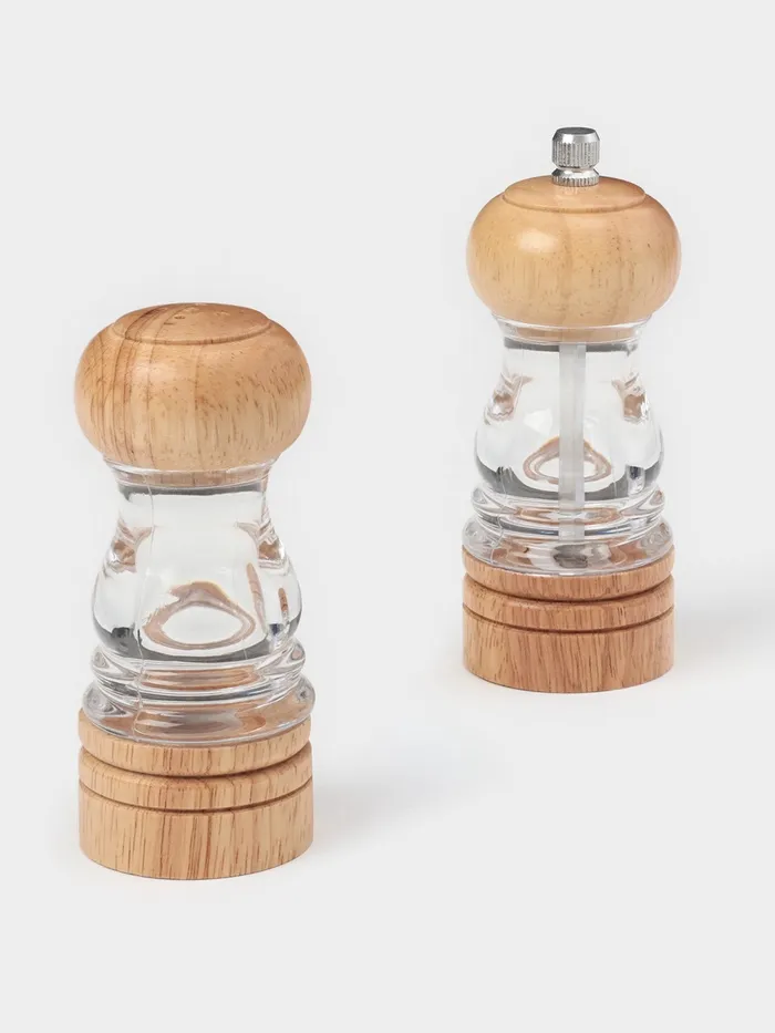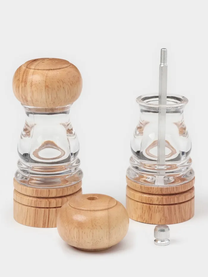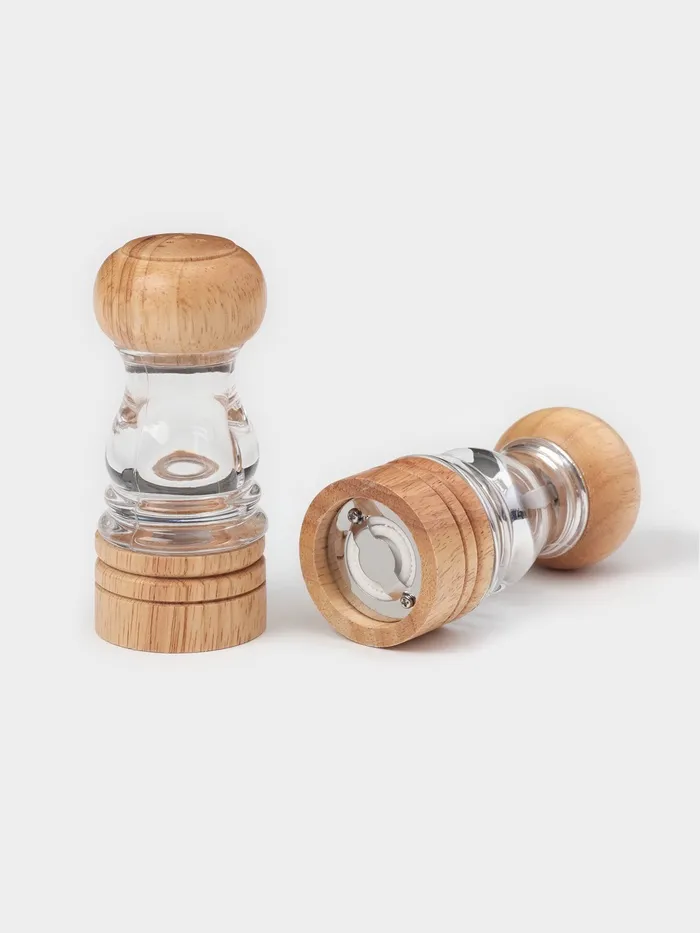 Набор состоит из двух мельниц размером 9,5x5 см и 10x5 см, выполненных из натурального дерева с элементами пластика и керамическими механизмами. Керамический механизм не только долговечен, но и обеспечивает равномерное измельчение специй, сохраняя их аромат и свежесть.