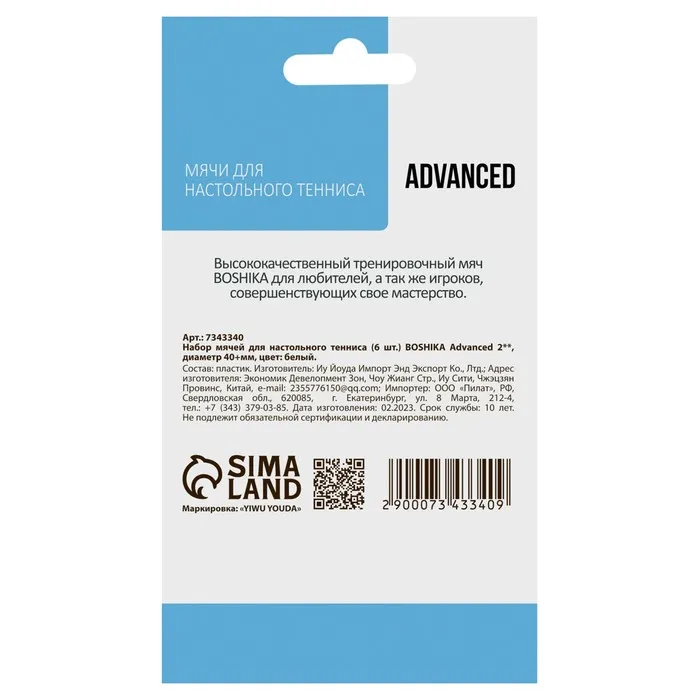 Набор мячей для настольного тенниса BOSHIKA Advanced 2*, d=40+ мм, 6 шт., цвет белый — Характеристики