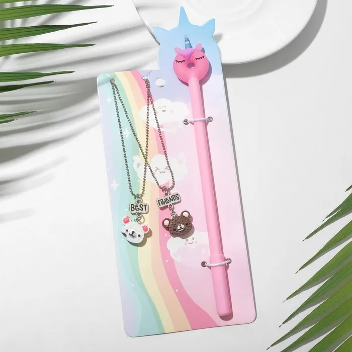 Этот набор из трёх предметов объединяет в себе нежность и практичность, создавая идеальный подарок для девочки. В комплект входят два кулона с изображением милых медвежат — символов дружбы и верности, а также стильная ручка с цветным эмалевым покрытием, которая станет верным спутником в учебе и творчестве.
