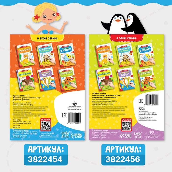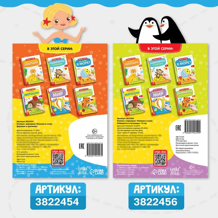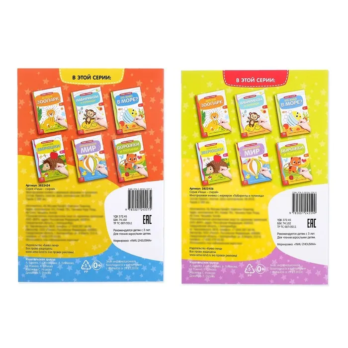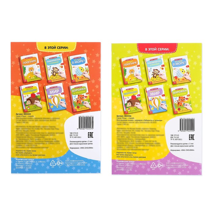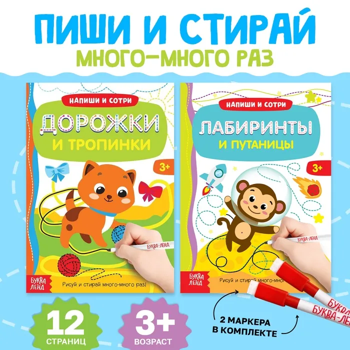 Книги с маркерами — это бесконечное удовольствие и развивающая игра в одном издании. Малыш может рисовать, обводить и выполнять увлекательные задания, а затем стереть всё написанное с помощью колпачка и начать заново. Маркер легко удаляется, и любимые задания можно выполнять снова и снова.