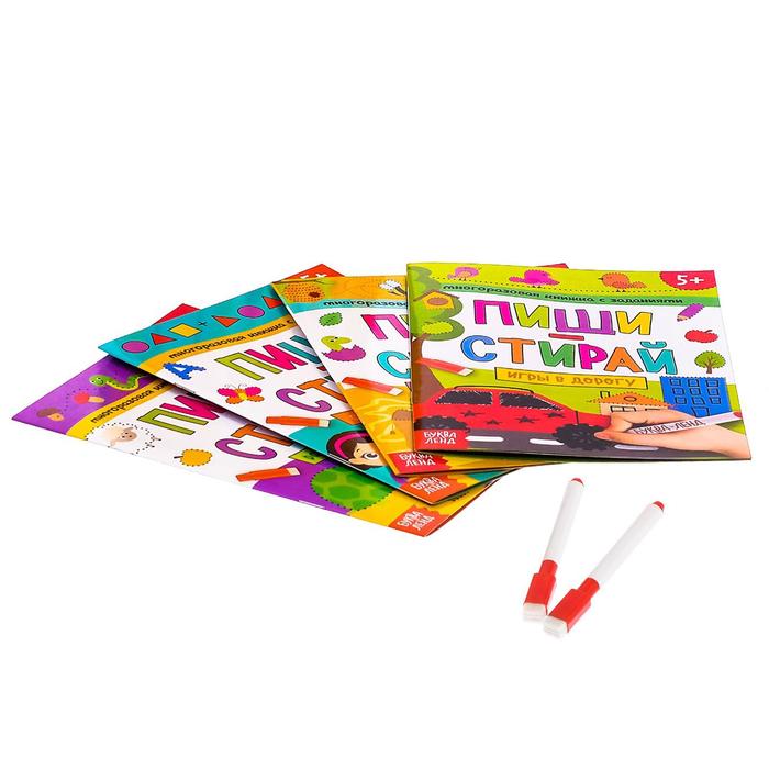 Книги с маркерами — это бесконечное удовольствие и развивающая игра в одном издании. Малыш может рисовать, обводить и выполнять увлекательные задания, а затем стереть всё написанное с помощью колпачка и начать заново. Маркер легко удаляется, и любимые задания можно выполнять снова и снова.